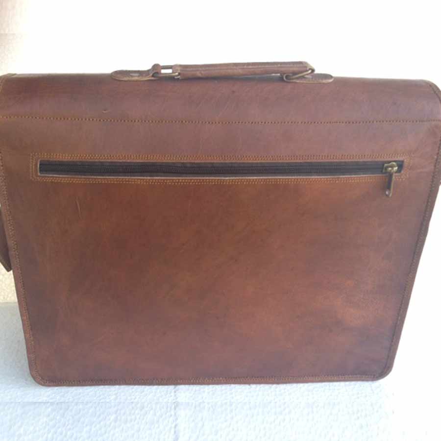 Veg tanning using natural edible oil and Sun tanning used for obtaining shades. Bag gives a wonderfully unique and antique look with use. A perfect companion and gift for your close ones. Made from 100% Genuine, Strong, lightweight, durable goat leather, tanned without the use of chemicals 2 small inner compartments and 1 big inner compartment for carrying larger files, laptop's etc. 2 inner zipper compartments for important documents/paperwork etc. Adjustable shoulder strap Vintage leather wash 3" deep, providing lots of space for cords, papers, books Full leather front flap Sturdy green canvas lining Leather softens and darkens with use Handmade in India by experienced craftspeople .